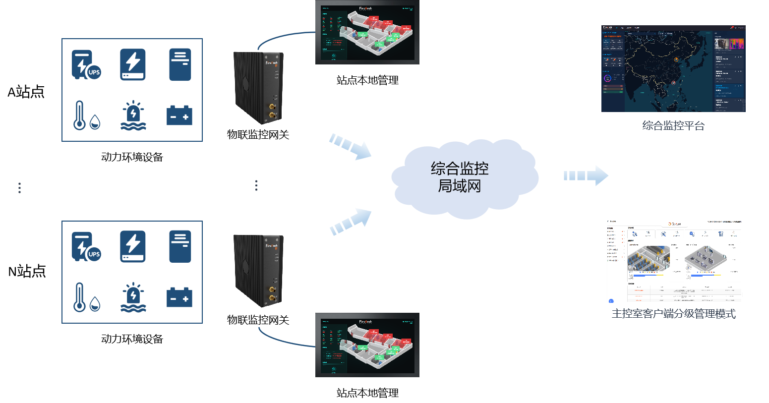 打造有效可靠的综合监控平台,将不同地域的分点数据中心或设备间动环设备进行集中监控管理,